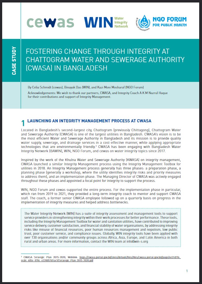 The Khulna Water Supply and Sewerage Authority (KWASA) launched an Integrity Management process in 2015 with the support of WIN, BAWIN and cewas. This report documents KWASA’s experience as a public sector utility and examines how integrity management is contributing to improved performance and strengthened integrity. The utility has generated change not only within the company but also among consumers and civil society by building an awareness campaign and establishing interactive sessions bringing together KWASA staff members and customers.