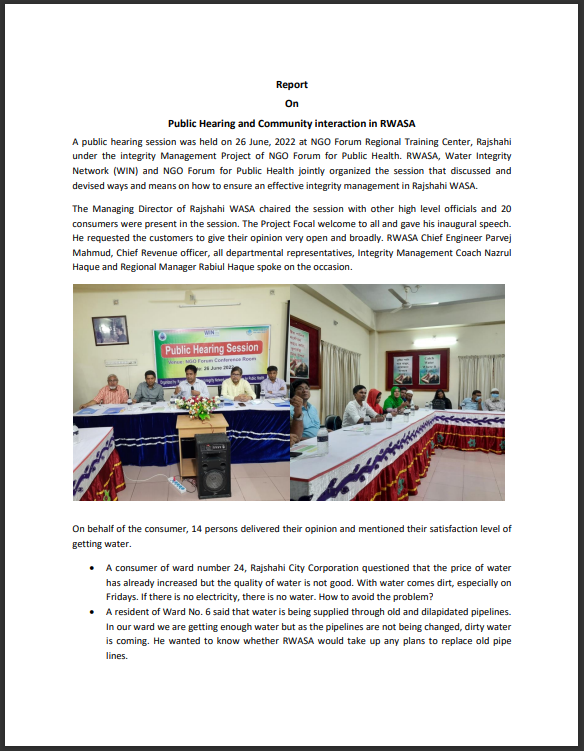 A public hearing session was held on 26 June, 2022 at NGO Forum Regional Training Center, Rajshahi under the integrity Management Project of NGO Forum for Public Health. RWASA, Water Integrity Network (WIN) and NGO Forum for Public Health jointly organized the session that discussed and devised ways and means on how to ensure an effective integrity management in Rajshahi WASA