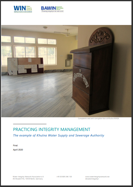 The Khulna Water Supply and Sewerage Authority (KWASA) launched an Integrity Management process in 2015 with the support of WIN, BAWIN and cewas. This report documents KWASA’s experience as a public sector utility and examines how integrity management is contributing to improved performance and strengthened integrity. The utility has generated change not only within the company but also among consumers and civil society by building an awareness campaign and establishing interactive sessions bringing together KWASA staff members and customers.