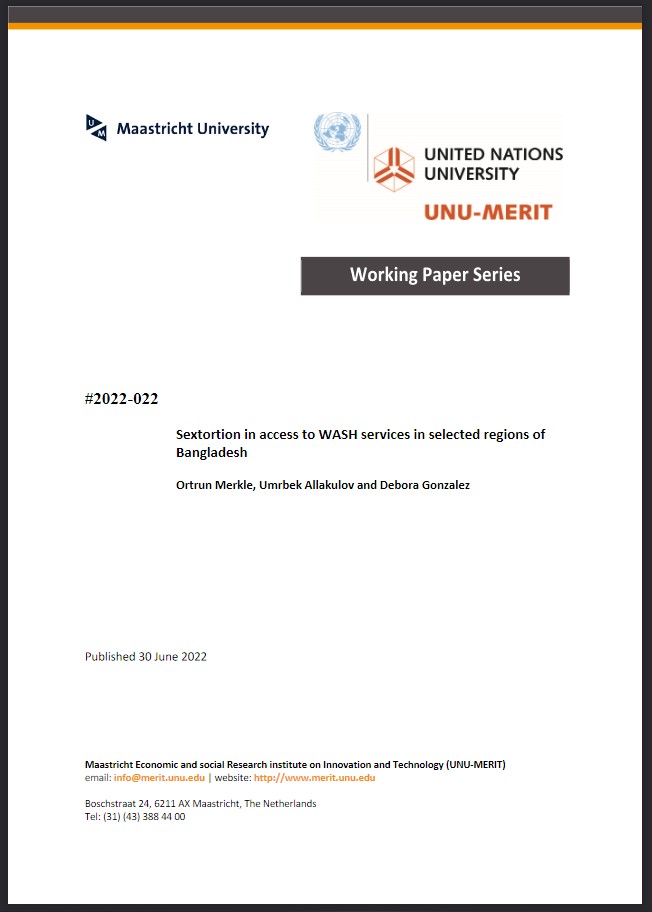 This paper investigates the incidence and risk factors associated with sextortion in accessing water, sanitation, and hygiene (WASH) services by women in selected regions of Bangladesh. Sextortion is defined as “the abuse of power to obtain a sexual favor” (IAWJ, 2012, p.9) and takes place at the intersection of corruption and sexual violence. The paper analyses original data from a standardized survey, alongside key informant interviews and focus group discussions collected in 2021 in four areas of Bangladesh.